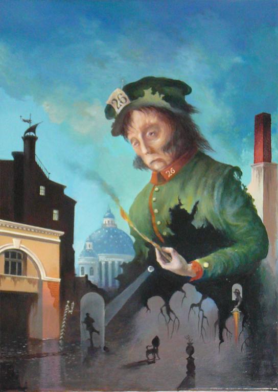 Побывал на открытии этой выставки в Арт-кафе "Старый Питер" на Суворовском 56. Попробую загрузить фото. Первая - "Петроградский Мессия" (Распутин), вторая - "Геоморфологическая панорама Петербурга", потом "Нос" (по Гоголю), и "Призрак Щепяного переулка".
