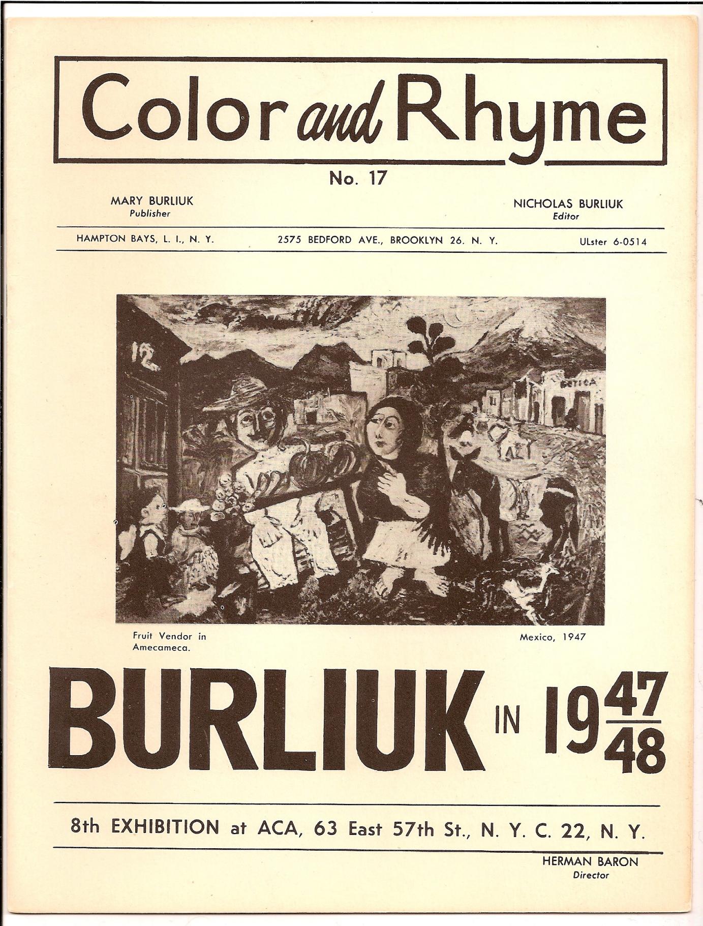 Продаётся коллекция материалов, относящихся к американскому периоду жизни Давида Бурлюка 1920х-1960 годов: 27 журналов (30 выпусков) "Color and Rhyme", 19 каталогов персональных выставок, 39 открыток, 6 книг, машинопись (возможно неопубликованная) перевода стихов Давида Бурлюка его сыном Николаем Бурлюком на английский язык, плакат персональной выставки в Lyzon Gallery и две графических работы - карандашных рисунка 1928 года. "Усиленный" вариант коллекции будет включать в себя дополнительно 3 книги и 3 графических работы. Возможно также включение в коллекцию маслянного портрета жены художника Маруси Бурлюк, датированного 1920 годом. Большинство материалов (кроме книг и рисунков) может быть продано отдельно от коллекции.