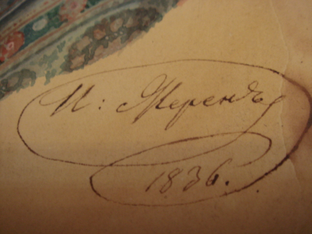 Думаю, что серьезных денег портрет по-любому не стоит, но и оставлять его себе большого желания нет (наверное, я "геронтофоб"). В то же время обидно, что простую, вроде бы, подпись не могу прочитать. Собственно, затруднения только с первой буквой (или двумя). Для очистки совести набрал в поиске "художник жерен-мерен", но, как и следовало ожидать слово "художник" делу не помогло. За информацию буду благодарен и, естественно, готов, (прежде всего - первооткрывателю), сей предмет недорого предложить. |