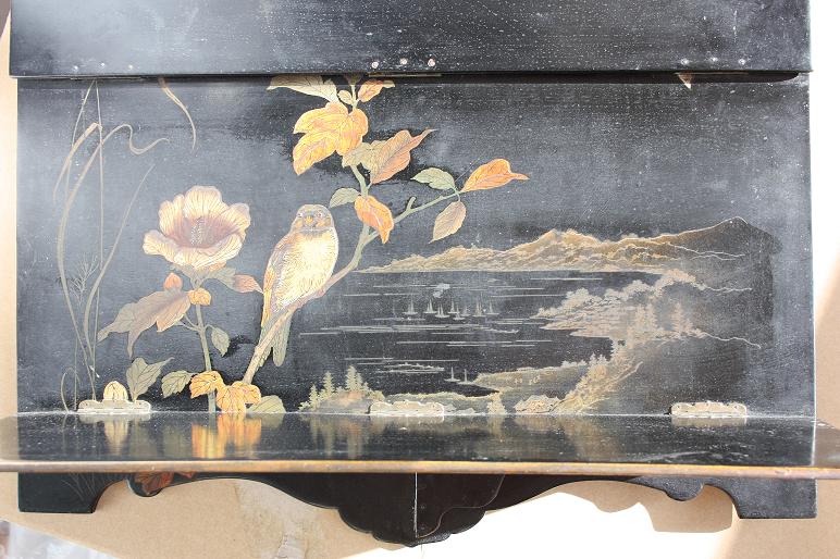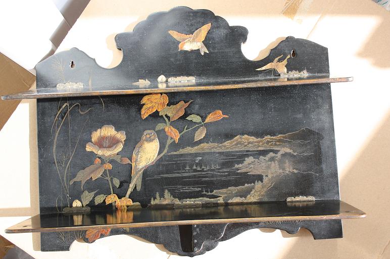 Shelf, presumably Japan. Material probably papier-mache. What is the price? Sincerely, Claire Sweet. |