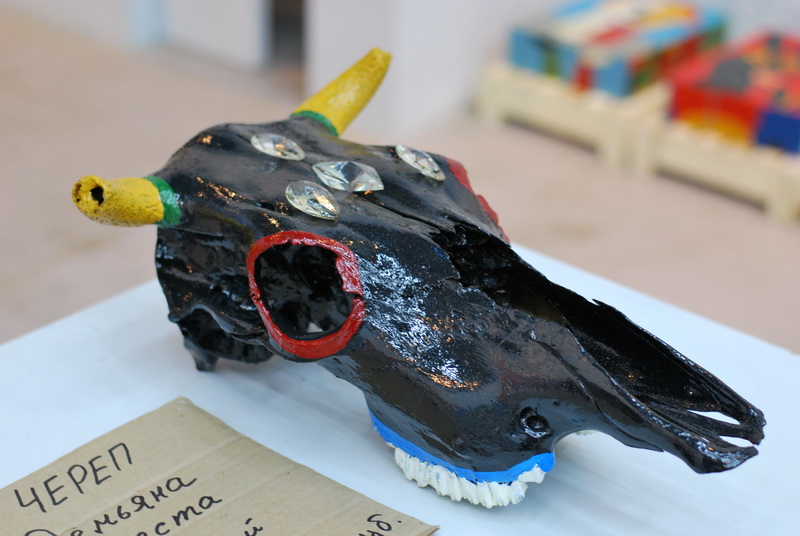 Судя по всему это «фабрика» реальных дальтоников, поэтому люди шифруются. Да и авторство тут не особо важно. По формату это больше похоже на народный промысел. Малотиражные безымянные вещи. Очень недорогие. Между поделкой и искусством. Большинство идей придумывает их "уорхол" Татьянин, а кто реализовывает – так ли важно? Конечно, это игра со зрителем. Утрированные сравнения, абсурдизм. В привезенной выставке можно выделить несколько магистральных тем: 1. Посвящение Йозефу Бойсу: панибратский диалог и игра с символами (заяц, жир, войлок и пр.) Очевидно, приурочено к выставке Бойса в ММСИ. 2. «Уралвагонзавод»: политический абсурдизм. 3. Малевич для бедных: супрематизм и крестьянский цикл. Вечно актуальная тема. 4. «Чисто конкретно»: в зависимости от носителя одна и та же работа стоит по возрастающей – бумага в три раза дороже варианта «холст-масло». Есть эконом-вариант, бизнес-класс и премиум-класс. Цены от 1000 рублей. Есть, наверное, и ниже, но это уже в развалах копаться надо. Но за 1000-2000 рублей можно купить «политическую» тарелку на тему «уралвагонзавода» как явления. Живопись – от 4000 рублей за небольшой формат. А за 6000 есть уже оргалиты приличного размера 70 х 40. На любой вкус и кошелек. Самые дорогие работы – 40-50 тыс. рублей – это циклы «Супрематизм для слепых» - фактурные супрематические рельефы из фанеры, вероятно. Весьма декоративно. В дополнение к ним можно подобрать более бюджетные фанеры из «крестьянского цикла» - 10-20 тысяч рублей.