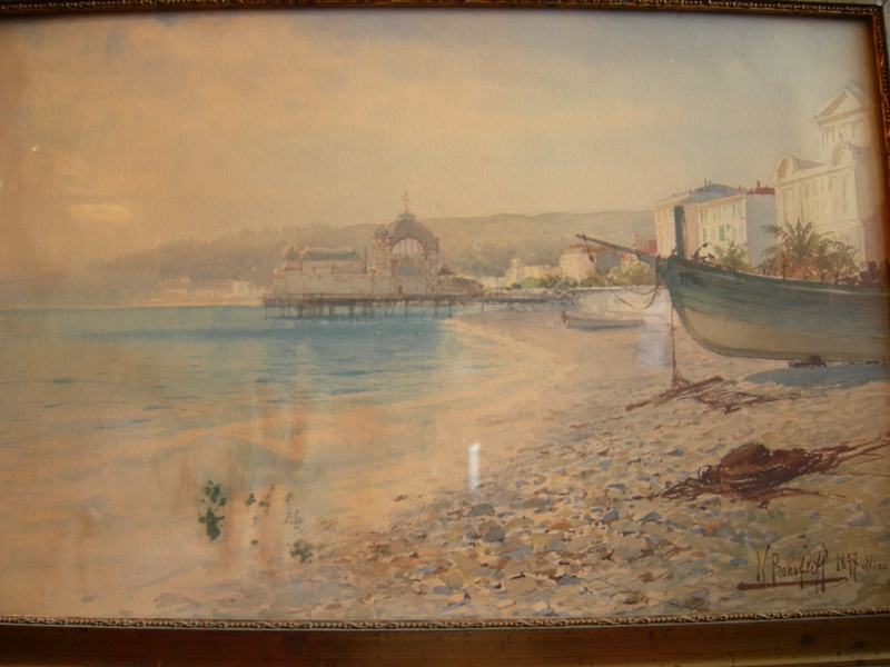 Родился в морской семье: отец его служил во флоте капитаном 2-го ранга, а дед был героем турецкой кампании и отличился в бою на бриге "Меркурий". Еще на школьной скамье принимал участие в работах по отделке дома С.П. Дервиза, внутреннему убранству Императорской яхты "Полярная звезда" и вообще по художественной промышленности у архитектора Н.Набокова (1886-90). По окончании в 1885 г. Николаевского реального училища поступил в Академию художеств, где готовился к "пейзажному искусству". В 1888 г. перешел на архитектурное отделение, а через год допущен на композиции. Самостоятельно начал работать с 1890 г., оканчивая начатую совместно с архитектором гр. Карповым постройку собора Валаамского монастыря и монастырской больницы.Для того же монастыря исполнил и другие работы: им построены и отделаны внутри церкви-скиты на островах Тихвинской Божией Матери и св. Германа; составлены проекты монастырской часовни в Петербурге (на 16 линии Васильевского острова) и подворья с церковью и жилыми домами в Москве.В 1892 г. выдержал конкурс на малую, а в 1894 г. - на большую золотую медаль и удостоен звание классного художника 1 степени. Состоял преподавателем технического рисования в ремесленном училище Цесаревича Николая. В 1895 г. назначен пенсионером и на два года уехал за границу, где посетил Германию, Швейцарию и северную Италию. В Цюрихе состоял на практических работах у архитектора Эрнста, по заказу которого исполнил проект большой гостиницы для Ривьеры - Hotel a Pavillon (Pegli).По заданию Академии воспроизвел уничтоженные пятью пожарами работы разных мастеров в Palazzo Ducale в Венеции. Эти работы, приобретенные Академией в собственность, принесли ему в 1902 г. звание академика архитектуры.В 1902 поступил на службу в хозяйственное управление при Св. Синоде, которую впоследствии совмещал со службою в Первом Российском страховом обществе и на Балтийском судостроительном заводе, где около пяти лет он занимался отделкой и украшением кораблей. Им обработаны нос и корма и исполнена внутренняя отделка броненосца "Император Александр III"; произведены наружная и внутренняя отделка крейсера "Алмаз", исполнены чертежи и рисунки для Императорской яхты "Александрия".В 1902 наблюдал за постройкой в Киеве (производившейся местным архитектором) дома Первого Российского страхового общества, на службе которого он состоял около 15 лет; проектировал и строил дом для отделения Русского для внешней торговли банка в Риге.Архитектор Придворно-конюшенной части. Руководил акварельной обработкой дипломных проектов в Институте гражданских инженеров. Кроме архитектуры, покойный занимался также живописью. Состоя действительным членом С.-Петербургского общества русских акварелистов, он почти ежегодно участвовал в выставках общества, преимущественно произведениями морских видов. Картина "Ницца" 1897 год. Акварель. В моей семье с начала двадцатого века. Из рамы не вынималась, не реставрировалась. Размер без рамы 50х33см. 150000 руб. Последний раз редактировалось madmi; 29.10.2012 в 14:32. |