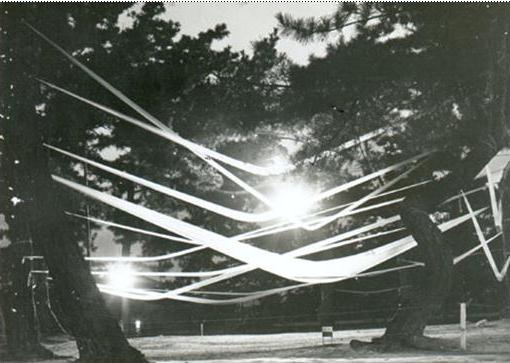 Садамаса Мотонага: развешивает на ветвях сосен мешки из пластика, наполненные окрашенной водой; использует дым, которому он придает округлую форму при помощи специальной машины Мукаи Шужи: заполняет пространство воображаемым алфавитом Последний раз редактировалось LCR; 28.08.2008 в 01:49. |