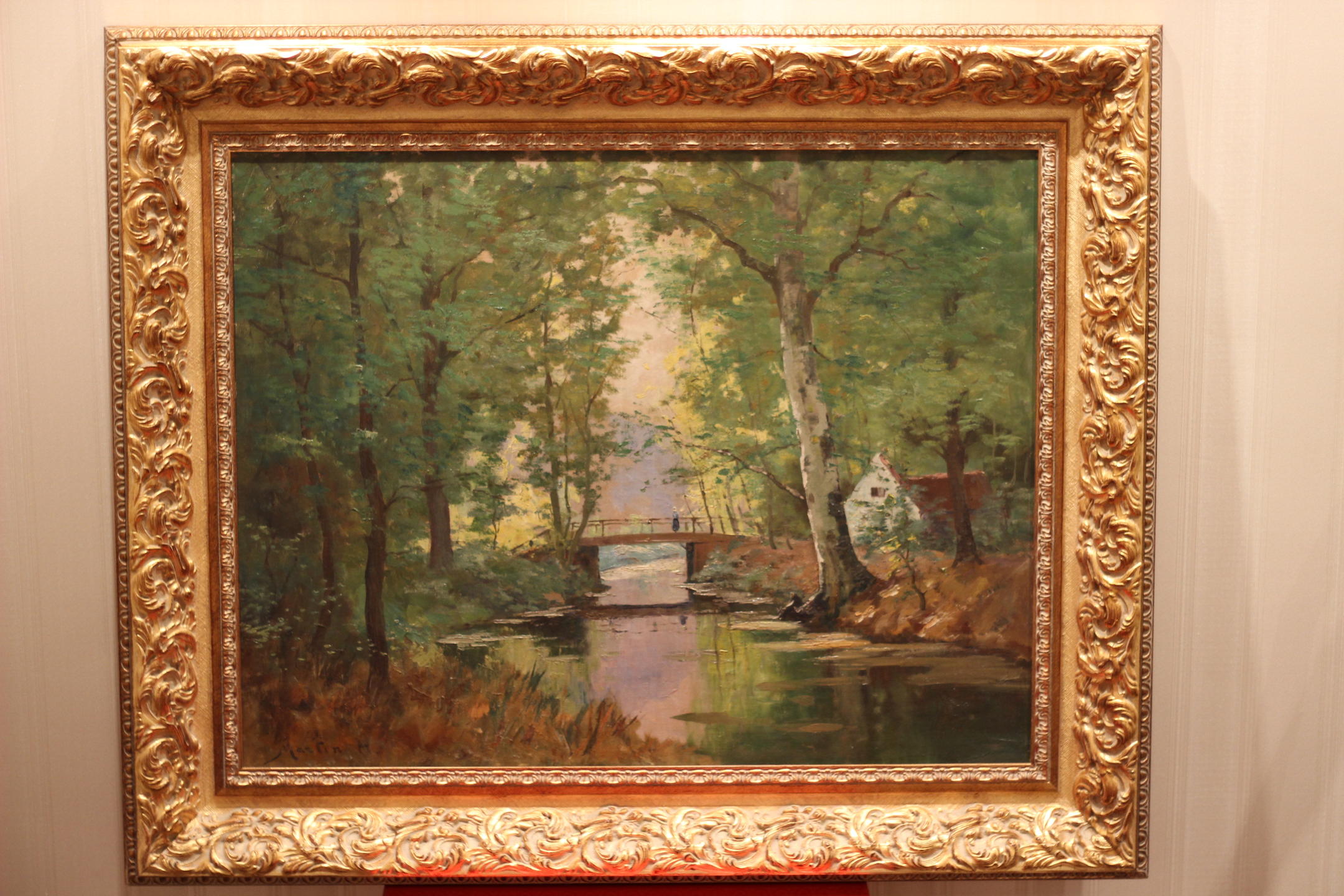 Martin H. (по подписи). "Полдень в английском парке". Холст, масло. 70х90 см. Западная Европа, предположительно Англия, конец XIX - начало ХХ века. В Итальянском багете, Кракелюр, мелкие дефекты красочного слоя, потертости холста, на обратной стороне холста в нижней части картины - реставрационная заплатка. Судя по подписи и творческому почерку данная картина принадлежит кисти английского художника - пейзажиста Х. Мартина, работавшего на рубеже XIX-XX веков. Реалистические пейзажи мастера, как правило, выполнены согласно живописным тенденциям своего времени в "свободной" манере, - широкими, немного пастозными мазками, делающими красочную поверхность холста рельефной. "Кулисное" построение композиции, обрамленной изображениями деревьев, выражает почтенное отношение автора к традиционному академическому наследию европейских живописных школ, и в то же время приносит на полотно гармонию и равновесие; заросшая река медленно текущая в сторону моста, уводит взгляд зрителя в глубину картины, туда, где кроны деревьев залиты полуденным светом, озаряющим хрупкую фигуру глядящей вдаль женщины. Весь пейзаж, пронизанный тишиной и спокойствием, носит оттенок "лирического" характера, свойственного для многих художников-романтиков рубежа веков. Картины Мартина имеют историю продаж на европейских аукционах.
