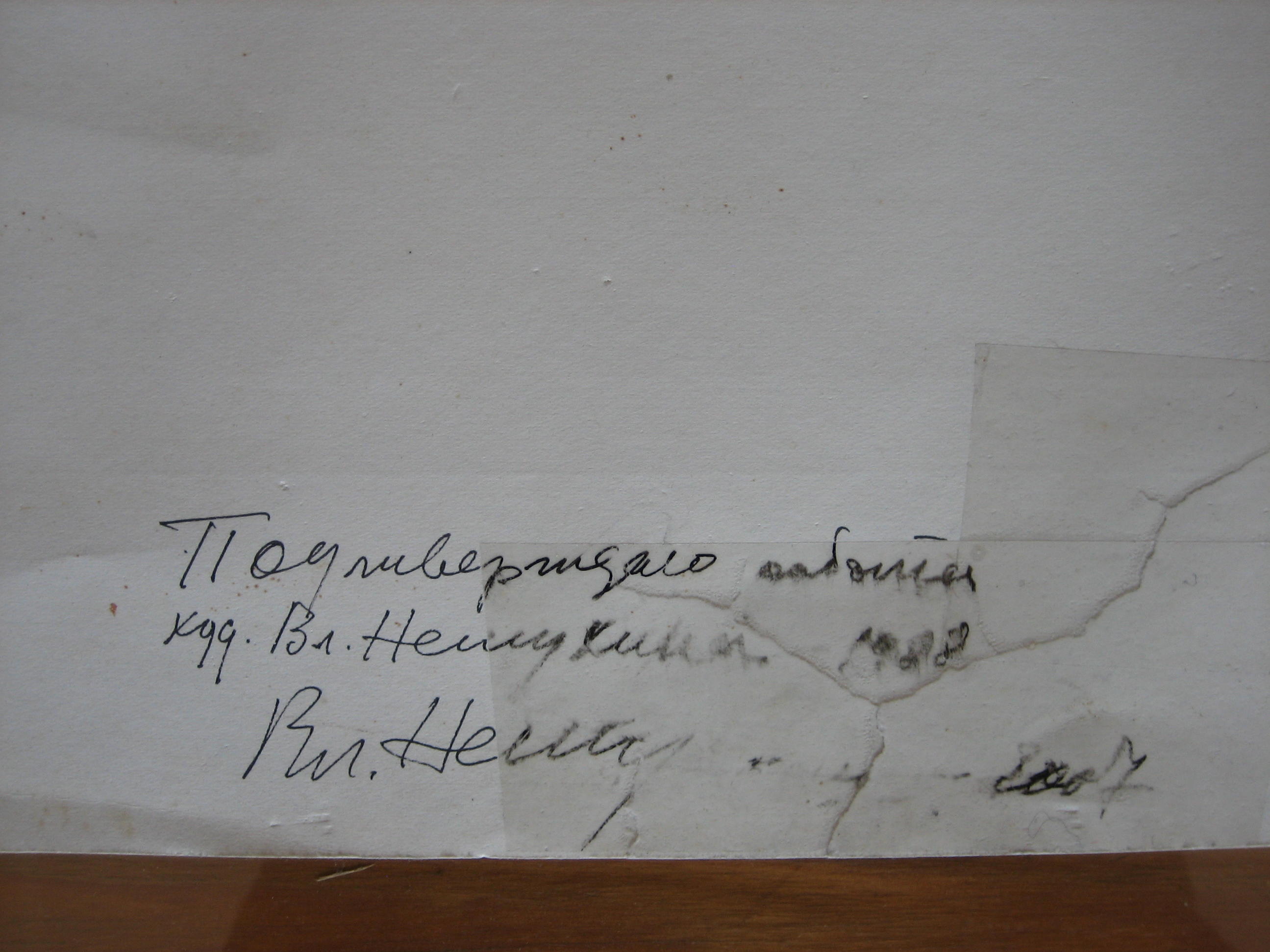 Mixed media on paper , collage. Unframed . Dimensions: 69.5 x 77.5 cm Year: 1988 . Signature and date: " Ow. Nemukhin /1988 "( bottom center ) . On the back side : - Of witnessing the inscription: "I confirm thin work . Ow. Nemukhin - 88 " , the artist's signature and the date 2007 ( at my request Vladimir assured authenticity of the picture ) - Stamp: "The Ministry of Culture of the USSR . Allowed to be exported from the USSR " (stamp was placed in Leningrad in 1989 , when I designed the pattern of export of the USSR ) Condition: small tears bottom edge ( visible in the photo ) . Location paintings: Brussels Price: 9000 €. There is a document entitled " Inspection Painting" from 25.09.1989 , issued by a customs officer when I export pictures from the USSR. Literature ( prints, similar in composition ): - Album «Wladimir Nemuchin» ( edition GALERIE BARGERA, Cologne ), page 80 - " New album charts " ( publishing house " Soviet Artist" , 1991 , ISBN 5-269-00080-6), page 68 . This album is attached to the picture. |