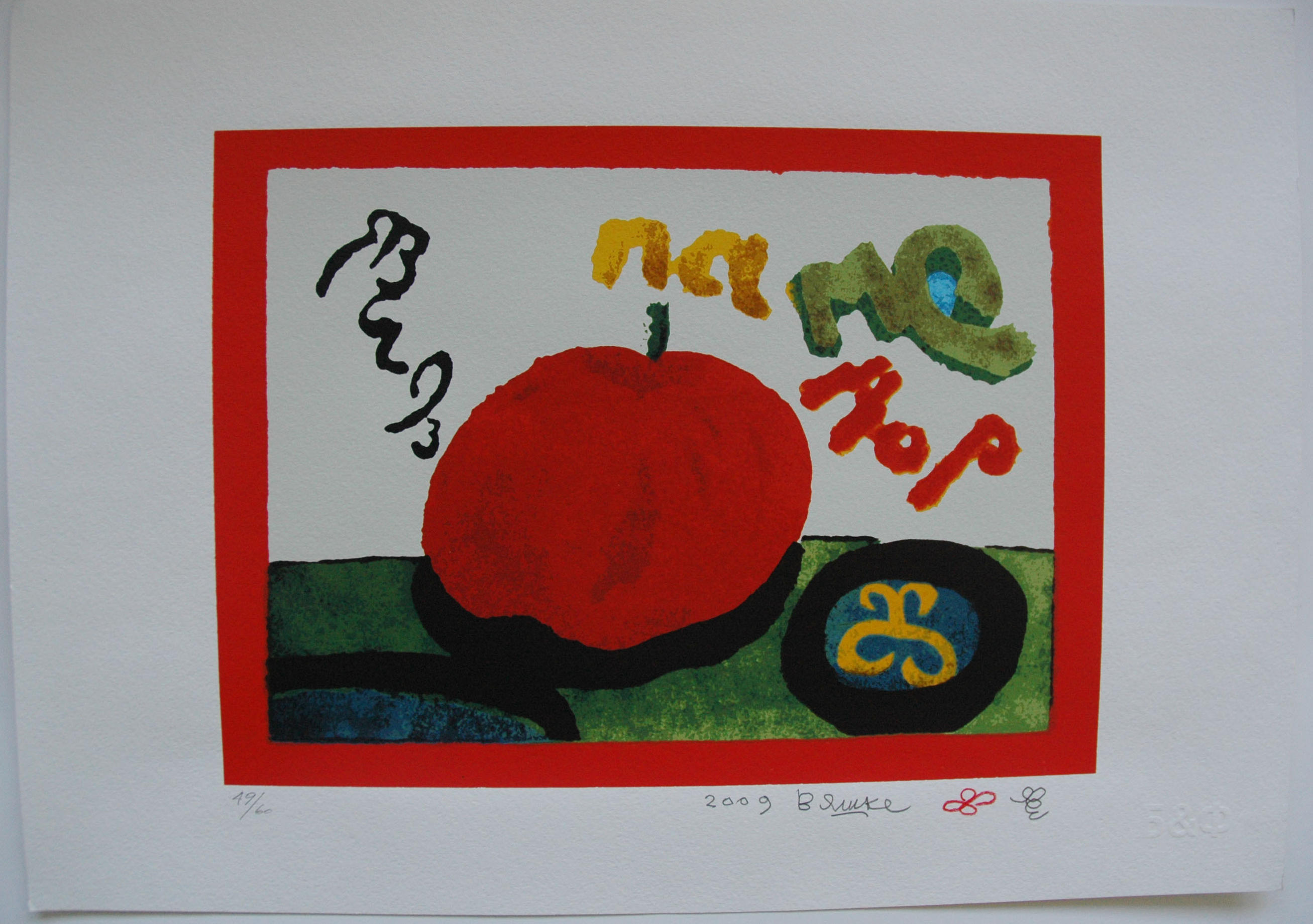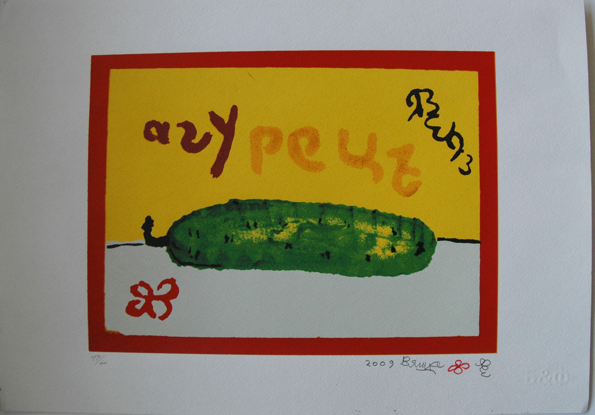 серия из 9-ти эстампов «Трафареты» (условное название) 2009, шелкография, 42 x 29,7cm, издатель: студия ручной печати Б&Ф, тираж: 60 + XX A/P 38500 рублей В 1993 году Владимир Яшке увлекся техникой трафаретной печати. Он кустарным методом изготовлял бумажные трафареты (отдельный трафарет на каждый цвет) и вручную набивал изображение водяными красками с помощью губки-тампона. Из-за низкой технологичности и высокой трудоемкости процесса автору редко удавалось сделать более трех отпечатков каждого сюжета, а зачастую работа так и оставалась отпечатанной в единственном экземпляре. В 2009 году студия ручной печати Б&Ф предложила Владимиру Яшке сделать своего рода «репринтное» воссоздание всех этих произведений в технике шелкографии, каковая по сути своей является ни чем иным, как высокотехнологичной разновидностью все той же самой трафаретной печати. Всего известно 10 «трафаретных» произведений Владимира Яшке. Нам удалось разыскать и адаптировать к шелкографской технике 9 из них, следы десятого известного нам произведения (условное название «Пейзаж с синим небом») на сегодняшний день утеряны. 1. «ПОЦЕЛУЙ» 1993-2009 2. «КАВКАЗСКАЯ СЕМЬЯ» 1993-2009 3. «ПРОГУЛКА ПО БОРОВОЙ» 1993-2009 4. «КАК ПРОЙТИ НА КОЛОКОЛЬНУЮ?» 1993-2009 5. «АГУРЕЦЪ» 1993-2009 6. «ПАМЕДОР» 1993-2009 7. «ДЕВУШКА В ШЛЯПКЕ» 1993-2009 8. «ЗИНАИДА МОРКОВКИНА С ИНОСТРАННЫМИ МАРЕМАНАМИ» 1993-2009 9. «ПЕРЕД ЗЕРКАЛОМ» 1993-2009 |