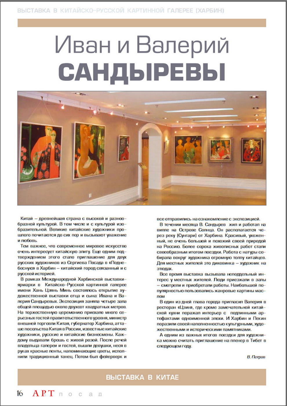 Статья о выставке Валерия Сандырева и Ивана Тарасовича Сандырева в Китайско-Русской картинной галерее имени Хань Цзянь Минь (город Харбин).