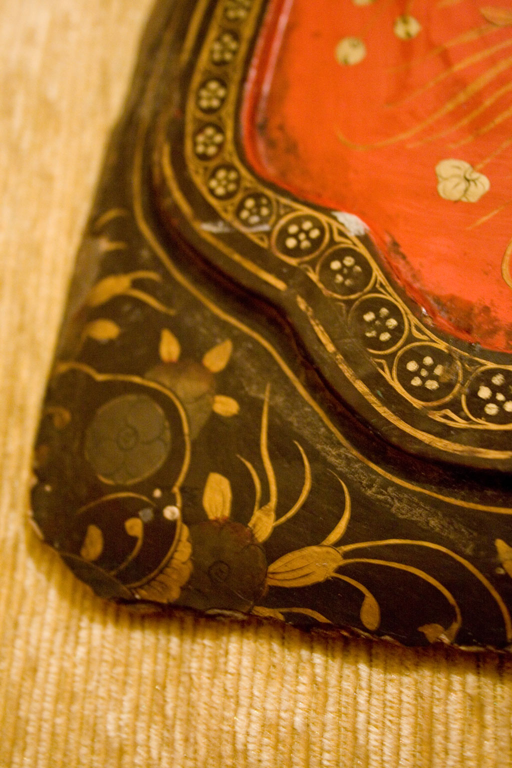 Панно на дереве (предположительно липа), написано с использованием позолоты. По словам антикваров 18-19 век. По словам двух искусствоведов - Россия, написанная под Китай, по стилю и исполнению очень похоже на панно из Лакового кабинета дворца Монплезир, но по форме непонятно, где оно там могло бы быть. Размер примерно 48*50 см.