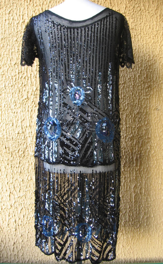 Продается бальное платье 1920-30гг, стиль ар-деко, ручная работа. Из черной х/б сетки (тюля) с вышивкой разноцветными желатиновыми пайетками 5 цветов и бисером 2-х типов. Рамер 46-48 (103х71см) Платье после реставрации.