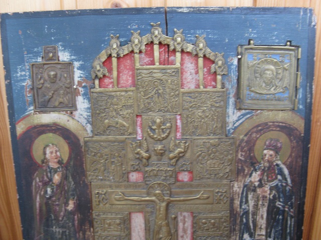 Икона врезка с приписными святыми Константином и Еленой, а также старообрядческой пластикой Спасом Нерукотворным и Николаем Чудотворцем
