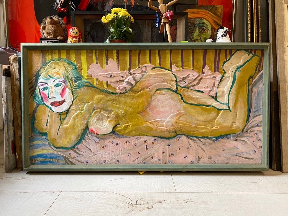 Феликс Волосенков, «Лежащая на кровати», оргалит/темпера/масло, 60 х 122 см., 1988 г.