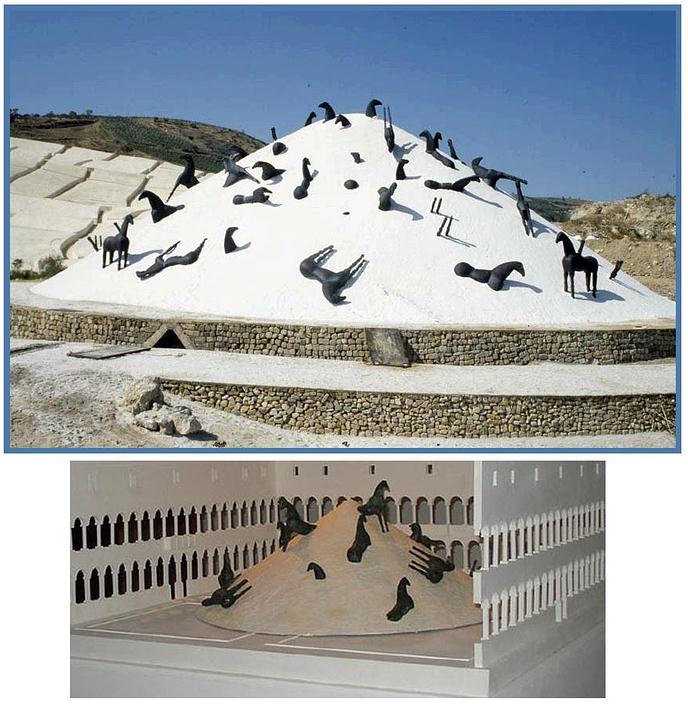 «Произведение» состоит из многочисленных элементов: силуэт дерева, на котором как бы в неустойчивом равновесии покоится цилиндр престидижитатора; фрагменты человеческих лиц; росписи углем, таинственные знаки, характерные для творчества художника; тридцатипятиметровый «Поезд», составленный из антропоморфных форм из железа и терракотты; в центре зала – ниша, в которой установлена бронзовая фигура человека, из спины которого произрастают ветви дерева. В центральной части экспозиции стены украшены фресками, на которых красным на белом фоне изображены кресты и другие геометрические знаки… |