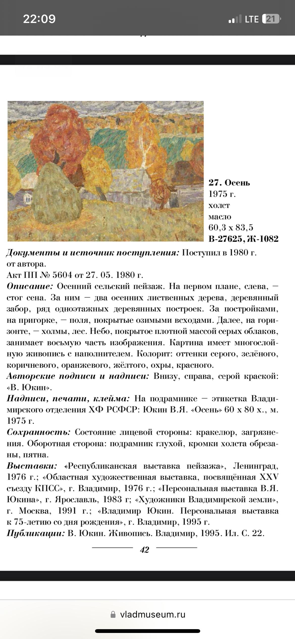 Попалась несколько лет назад такая вот небольшая работа. Оргалит, масло. Размер примерно 25 на 35. На обороте полустертая надпись: Юкин и дата, 1967 год. Слева от надписи есть какая-то затертость. Работа ОЧЕНЬ похожа на неоднократно писавшийся Владимиром Юкиным сюжет «Осень в Акиньшино». Ниже скриншот из Госкаталога. Там три очень близких работы. Все работы большие, старшая датирована 1967 годом. На всех есть люди на скамейке, стог справа зеленый. Маленькая - без людей, стог желтый. Обращался дистанционно за советом к спецам по Юкину - не может ли работа быть эскизом Юкина к его известному сюжету - отшили, сказали, что работа не его, и надпись Юкин сделана каким-то недобросовестным человеком. Прошу поделиться мыслями об этой работе. Последний раз редактировалось Gacetero; 29.10.2024 в 21:10. |