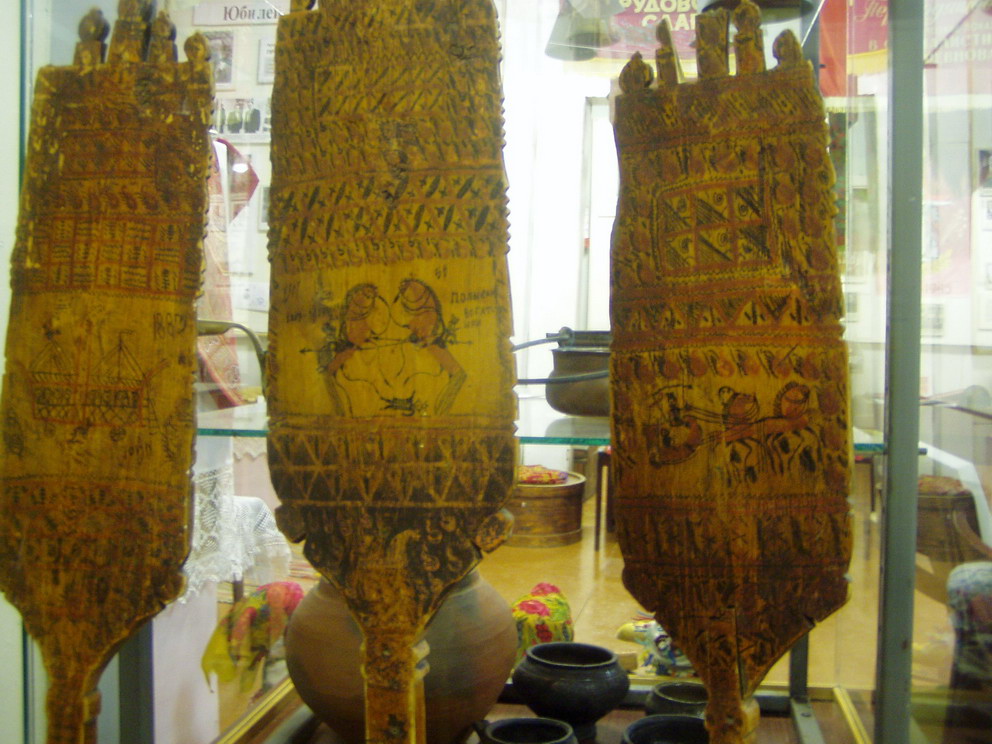 Russian distaff consists of standpipe with the blade (it is attached to the tow) and horizontal boards (the so-called stems, which sits on the spinner) connected at right angles.
