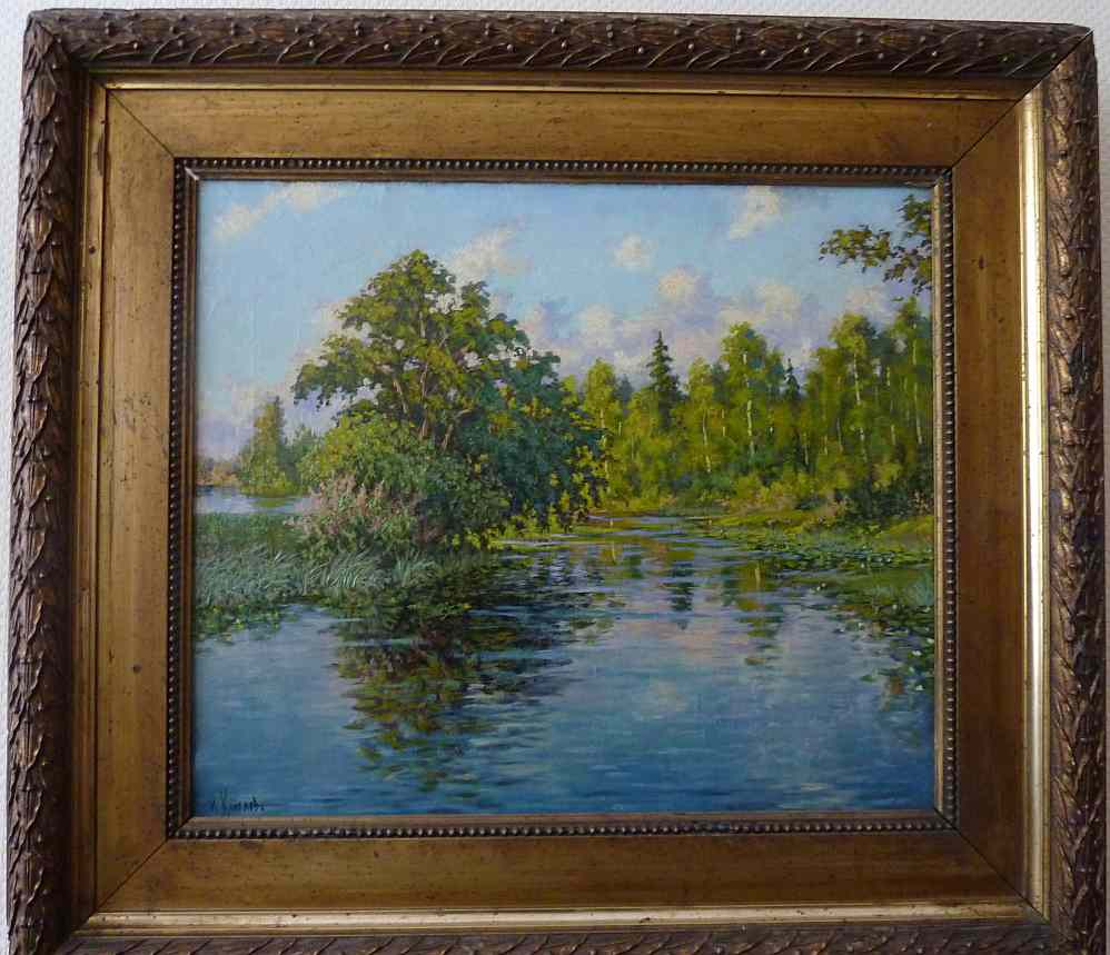 Николай Александрович Киселев(1876—1965), пейзажист, член СХ СССР, автор книги "Среди передвижников". Видел его пейзажи, и этот вполне может быть его же. Неплохой, кстати, пейзажик. Подписи не знаю. |
