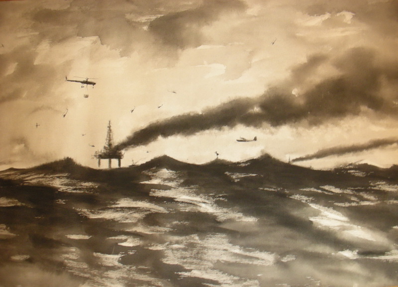 Фото 1: плюсы - есть текст и допускает концептуальную "развеску", комплесное оформление. Если собрать 4 рисунка вместе, то получится интересный сет размером не меньше 50 на 60. Минусы -- маленькие размеры (по отдельности). Фото 4: плюсы -- техника (хост) + узнаваемые образы. Сюжет мрачен, но дым над нефтевышкой -- это лучше, чем самолет над океаном. Минусы: исполинский размер, для двух метров такой красоты не просто будет найти место в помещении. Фото 5: плюсы: комфортный для графики размер и очень узнаваемые образы. Минусы: живопись лучше, чем графика. Чем лучше? Чем графика ![]() Фото 7: умиротворяющий сюжет, декоративно, спокойно. Дачка какая-то. Но вот хорошо ли для Батынкова отсутствие характерной катастрофы? Вот вопрос. В общем, сильнее всего колебался бы между фото 1 и фото 7