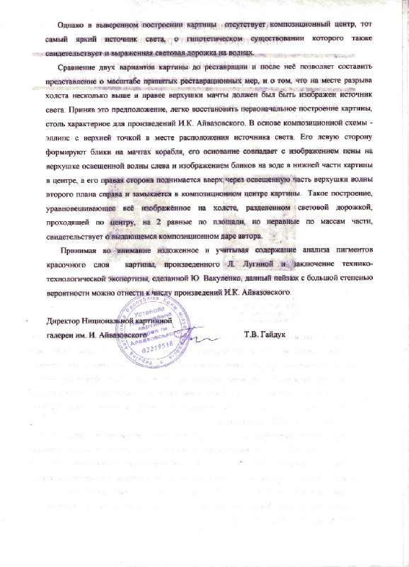 Если продавать картину на Украине, то возможно, этого и достаточно. Айвазовского подделывают часто и для полной уверенности картину надо сдать на исследование куда-нибудь еще (Грабари, Русский музей, Третьяковка и т.д.).