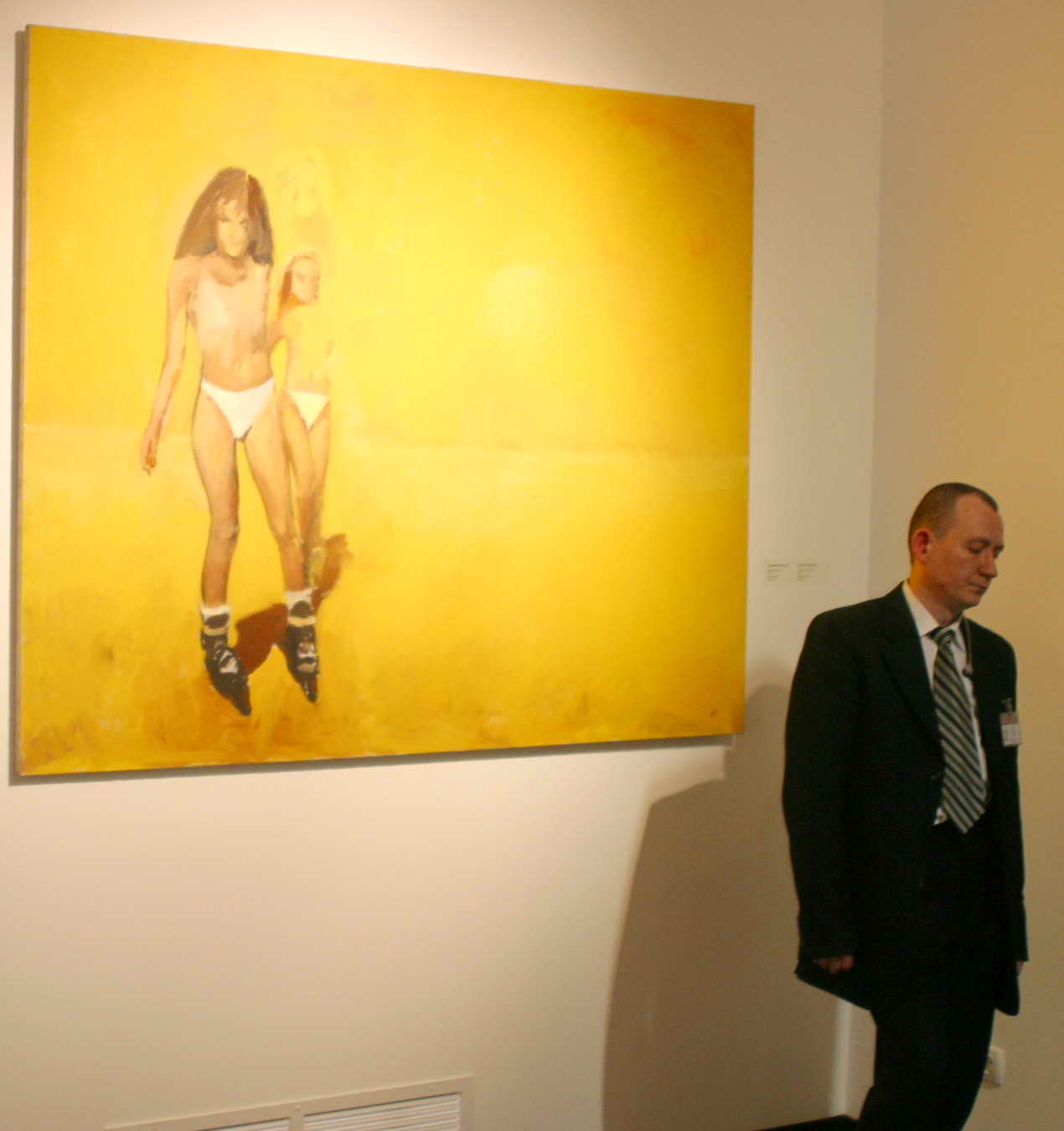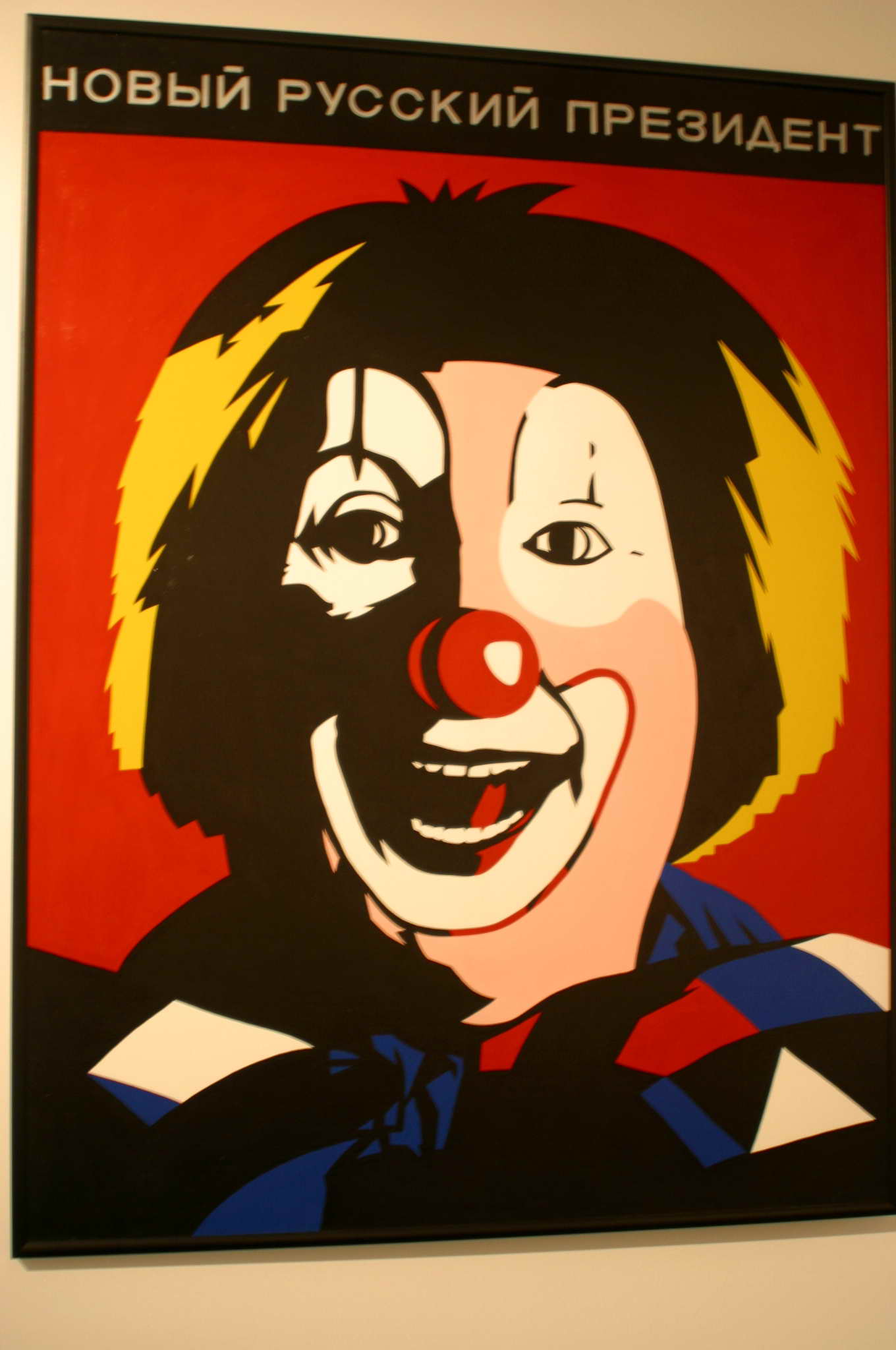 2. Сергей Шеховцов "Кинотеатр"№2 паролоновые фигуры в полутёмном зале. 3. Дубосарский Виноградов - огромная картина 3х4, когда подходил первая мысль - "какой плохой Глазунов" , потом - "Плохая подделка под Глазунова". И ещё - кто знает скажите: - как два человека могут работать над картиной? По очереди что-ли, или один намечает контуры, а второй раскрашивает?4-5 Коробки. Синие носы. Коробки замечаешь по звукам, из верхней доносится какое-то поскуливание-полаивание. Думал щенки там что-ли? А там три человека по очереди занимаются сексом, причём парни не снимая трусов и в ускоренном режиме. Называется это "реалити шоу" - так себе, почему-то почувствовал себя обманутым. 6.Кошляков "Мальчик". 7. Владимир Кожухарь "Жёлтая пустота" сфотографировал только потому что рядом стоял охранник и картина странным образом передовала его состояние. 8. Д. Врубель В. Тимофеева 2002 г. 9. Константин Латышев "Новый Русский президент" 2000 г. Это он так Путина себе представлял? 10. Пеперштейн. 2007 г. |