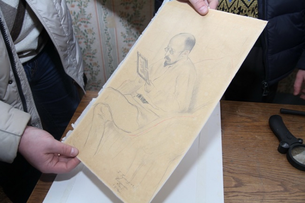 В музее большая коллекция работ Б. Кустодиева (графика по большей части) и самая большая коллекция работ Ефима Васильевича Честнякова (1874-1961) - живопись, графика, керамика. Церемония передачи рисунка музея проходила на фоне работы Кустодиева "Гуляние. В провинции" 1910г. (холст/темпера, 160,6х214,5) |