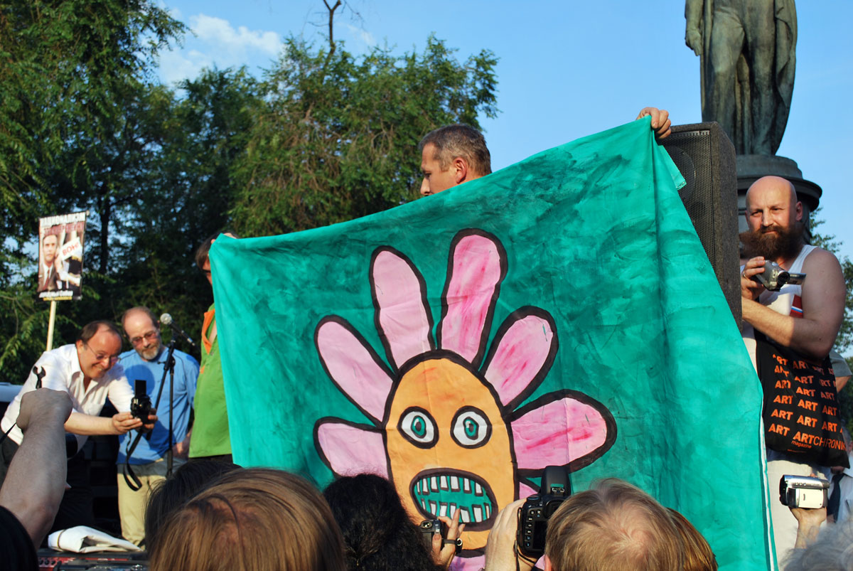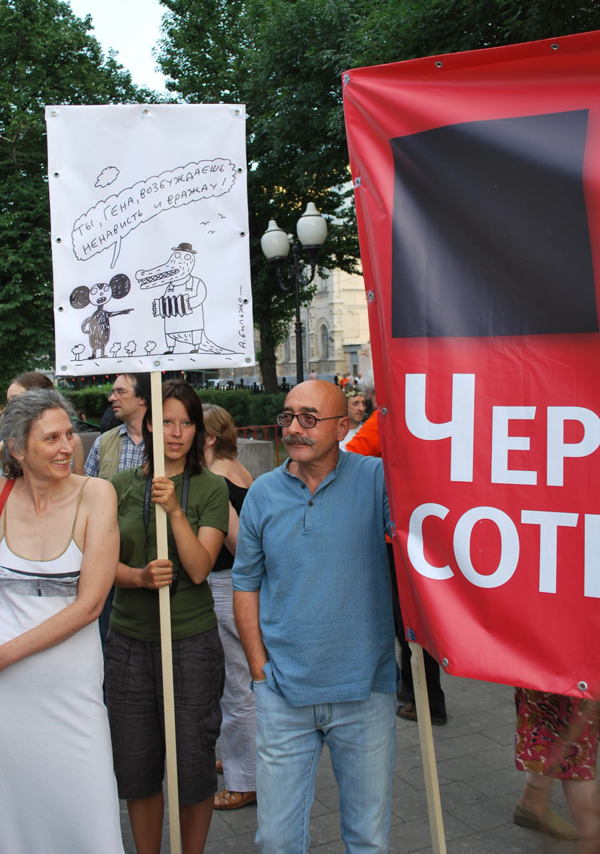 Сначала - персоналии. Пришло много известных людей, преимущественно художников. Имена и фамилии - в названиях файлов фотографий. Из художников в объектив попали Александр Косолапов, Александр Сигутин, Анатолий Осмоловский, Георгий Литичевский, Дмитрий Врубель (он был ведущим митинга), Дмитрий Гутов, Семен Файбисович. Андрей Бильжо выступал и как художники и как бывший психиатр. Из крупных фигур арт-рынка заметил только Михаила Крокина. |