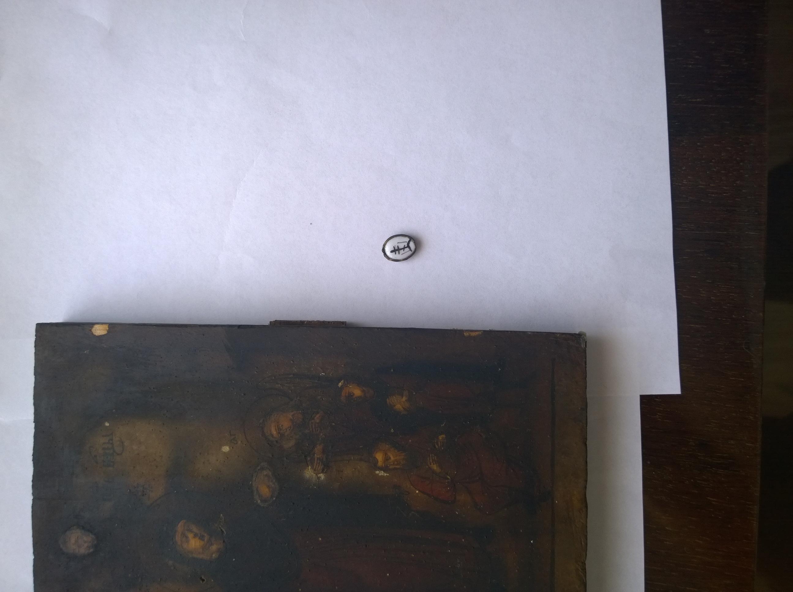 под чеканкой был маленький медальон в латунной оправе сам из какой-то глазури ![]() нписана на дереве разбирать не отважился т.к. фольга прибита маленькими гвоздиками ,более детально можно рассмотреть http://yadi.sk/d/ANugjUISGPeMg |