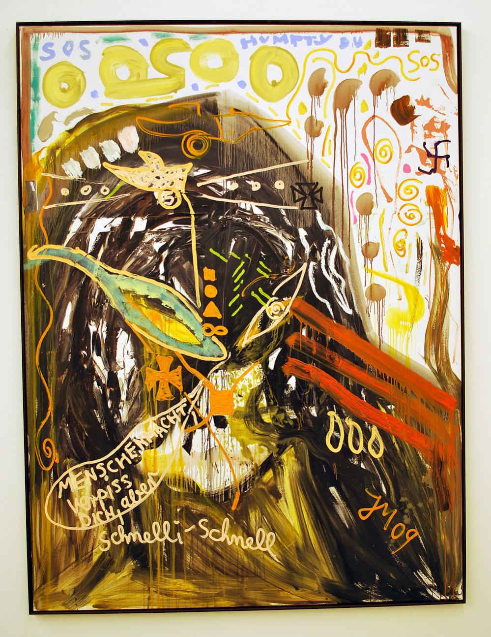 His creative style formally belongs to the neo-Expressionism. The artist seems to suggest the term "pop-historicism" is not conducive to clarity. Historicism in his works can be manifested through the historical quotes and symbols of the era. Photo collages with Hitler, swastikas and iron crosses - it is a historical greetings from the heir to the German Expressionist ranked as "degenerative art", one unsuccessful akvaleristu, who dreamed of a global "new order". And to enhance the effect in his compositions implemented the pants, washcloths, some wings, scraps of dirty magazines, Valium tablets. This may not be important, but the reception repetitive. In an interview, Meese told that a child is very shy and diffident, he found protection from the outside world in inventing their own language. Then he came up with 13 words and a few grimaces, which could explain everything. The language of his mature paintings left at least metaphorically, as untranslatable name works too reminiscent of the defensive reaction of the fast interpretations. Do not analyze anything, rely on emotions. Childhood was over, meet Baby «Kunst». The general impression from the exhibition in "Regina" - above expectations. Live, texture metaphors Meese crush size and abundance of details. Untrained spectator, said, meets Meese aggressively. But on the other hand, show him, for example, graphics, Egon Schiele and the reaction is likely to be similar. A few words about the price situation. In the auction statistics Meese - under one hundred and fifty entries. One only results for paintings 76. Not sold is not uncommon, but indicative of the material quite a lot. From fresh: February 12, this year's three-meter expression of The Temptation of the State of the Blesses Ones in Archland, made in 2003, was sold at Phillips de Pury for 111,5 thousand euros plus a fee, for a total under 130. Small by the standards of Meese meter work at auctions of contemporary art recently sold in the range of around 20 thousand euros. Two-meter - about 50-60 thousand Euro. Flagship canvasses Jonathan Meese in Regina also have very serious size, meter by two-two and a half. However, the choice of work and there are quite compact. Conditional pricing guidelines for products of this class can be respectively 70 and 5 thousand euro. Meese Exhibition Gallery "Regina" will last until July 4, 2009. |
