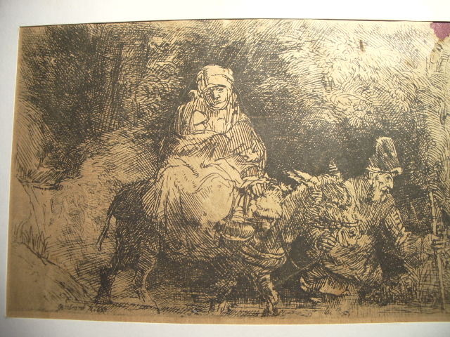 Ну, картинку-то найти не проблема. Это - известная гравюра (как, впрочем, и все гравюры Рембрандта), она называется "Бегство в Египет. Переход через ручей", размер ее 97 x 145 мм и исполнена она в 1654 г. Вопрос в том, когда же был сделан Ваш экземпляр? При жизни Рембрандта или позже? Это сильно влияет на цену. Гравюры Рембрандта печатались