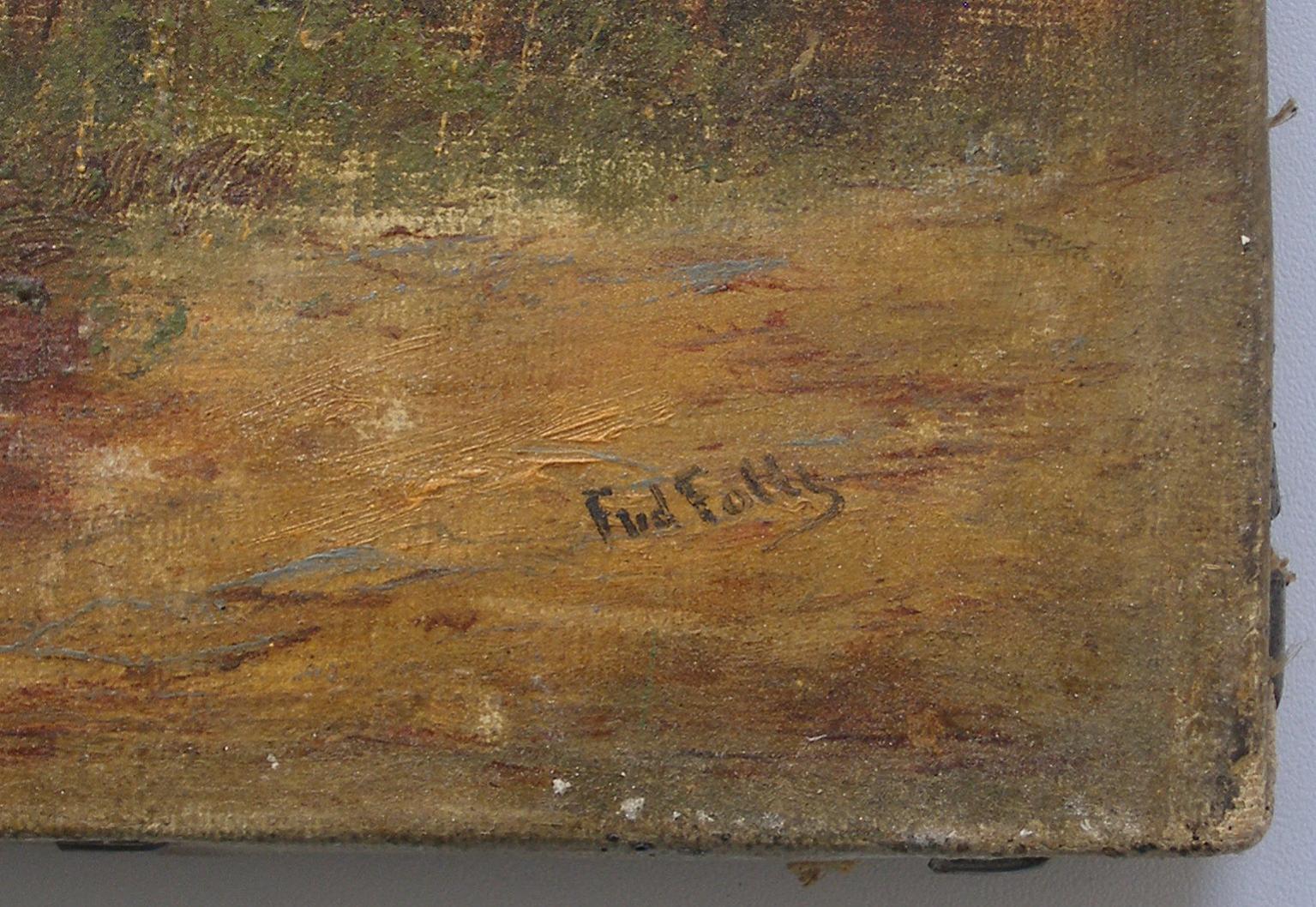 Картина Ваша все же любопытна. Ведь подпись можно прочесть и как "Frid Foltz". А ведь был такой довольно известный и популярный немецкий художник Фридрих Иоганн Фольтц (Friedrich Johann Voltz, 1817 - 1886). Фамилии этого Фольтца и того, что подписал Вашу картину, на слух звучат одинаково (по-немецки - тоже), однако пишутся по-разному. Фамилия Вашего - начинается на "Эф", а другого, известного - на "Фау". Подписи, само собой, разные. Вот тот Фридрих Иоганн Фольтц как раз очень любил сюжеты с бродящими по мелководью коровами и с удильщиками в виде стаффажа (см. вложения). Смею предположить, что Ваша картина написана неизвестно кем, но "под популярного Фольца", при этом автор картины, очевидно, не знал точно, как пишется фамилия "Voltz".