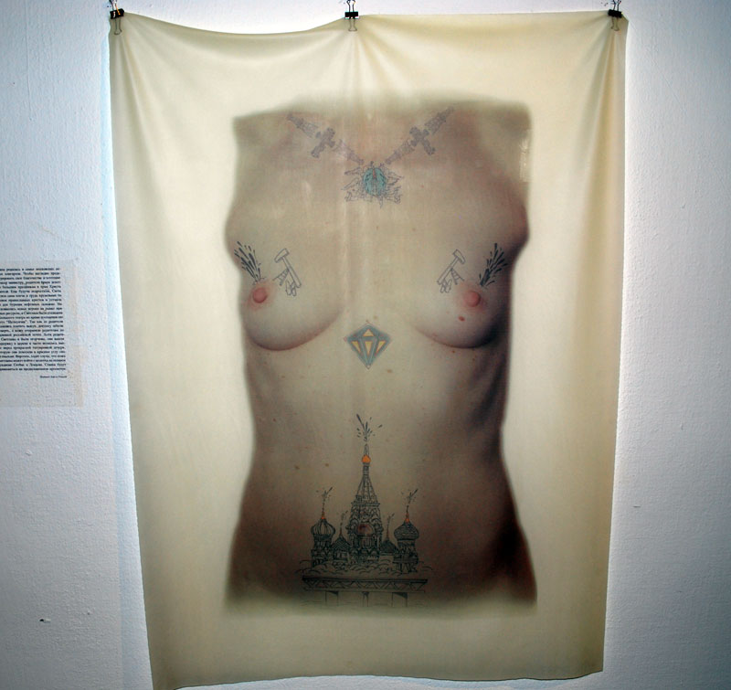 Целый коридорчик с кусками латекса, под кожу, на которых напечатаны торсы мужчин и женщин. Рядом мини рассказики, люди стоят читают. Я тоже попробовал - ужас.