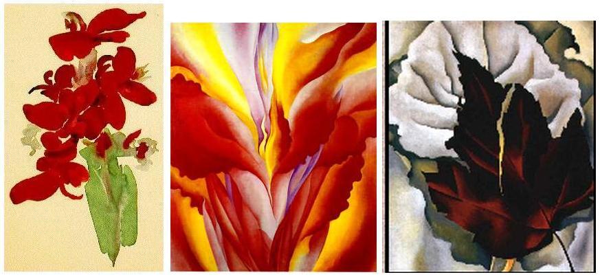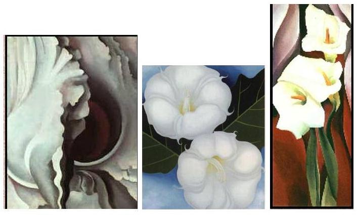 В 1917 г. Штиглиц организовал ее персональную выставку в своей авангардной галерее «291». Штиглиц оставил большое количество фотографий Джорджии О’Киф, ставшей его музой. В свою очередь, О’Киф вдохновлялась в своем творчестве урбанистическими фотографиями Штиглица. Следуя своему кредо – изображать не то, что она видит, а то, что чувствует, она исполнила серию пейзажей Нью-Йорка. В которой город превращается в некую фантасмагорию... Но особенно известны ее изображения цветов – странных, хищных, тревожащих. Писала она их не с натуры, а по фотографиям другого фотографа, Пола Стренда: «Я знаю, что я не способна написать уветок, не согу я и написать сияние солнца в яркой летний день. Но я надеюсь, что мне удается передать через цвет мое ощущение цветка или лучше сказать, мое ощущение, которое на какой-то момент становится важным благодаря цветку». Она умерла в 1986 г. в Санта-Фе.