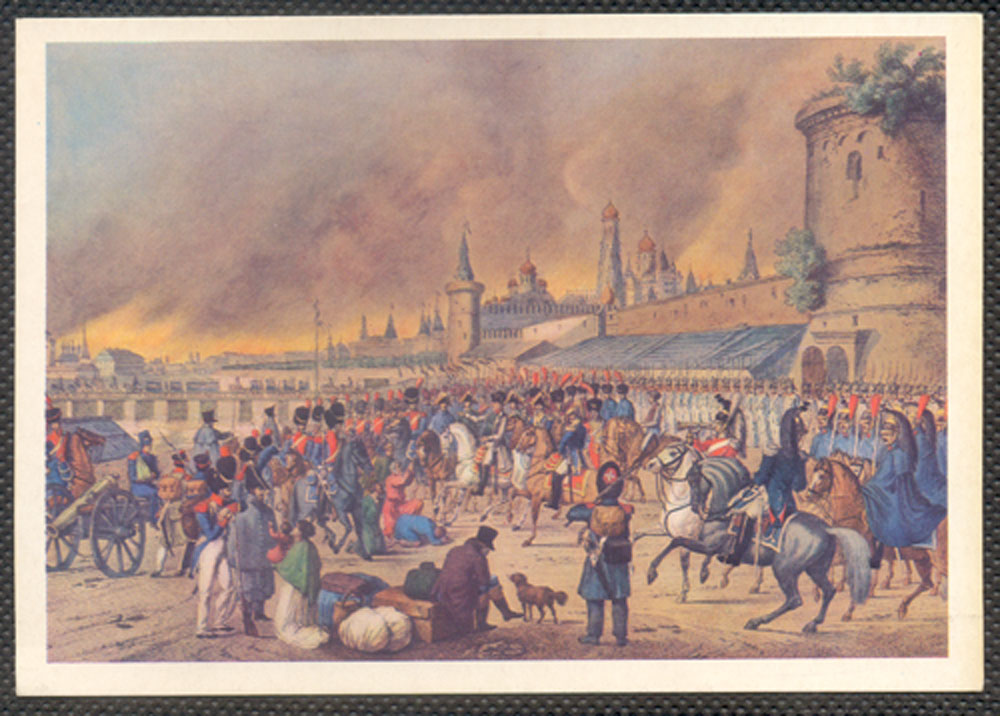 Исправляю неточность. Показанная открытка "Переправа через Березину" принадлежит П. Гессу и находится в Музее-панораме "Бородинская битва".