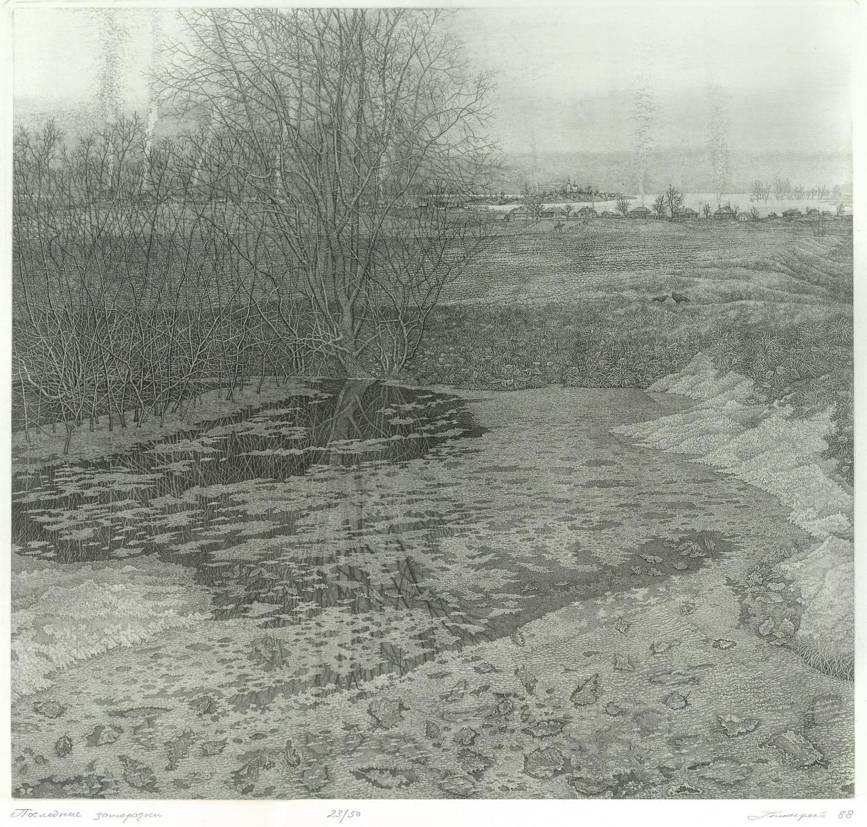 В середине 90-х годов Станислав Никиреев перецарапал все пластины. Во многие пластины были внесены новые детали. В основном, изменения произошли в деревьях: появилось веток, и все последующие оттиски после 90-х годов стали иметь новое состояние. Если нетрудно, скиньте пожалуйста фотографии офортов мне на почту: hariboo@rambler.ru |