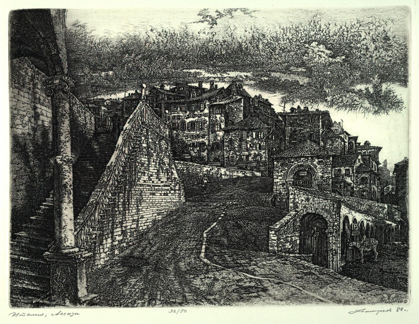 Рим, Колизей - 18000 руб. Рим, Собор св. Петра - 18000 руб. Сельский пейзаж - 30000 руб. Торжок - 25000 руб. Филин - 16000 руб. Флоренция, Набережная реки Арно, I-й вариант - один из 3-х офортов, не вошедший в альбом "По Италии". Пластина была украдена из архива Станислава Никиреева. Цена - 18000 руб. Флоренция, собор - 18000 руб. |