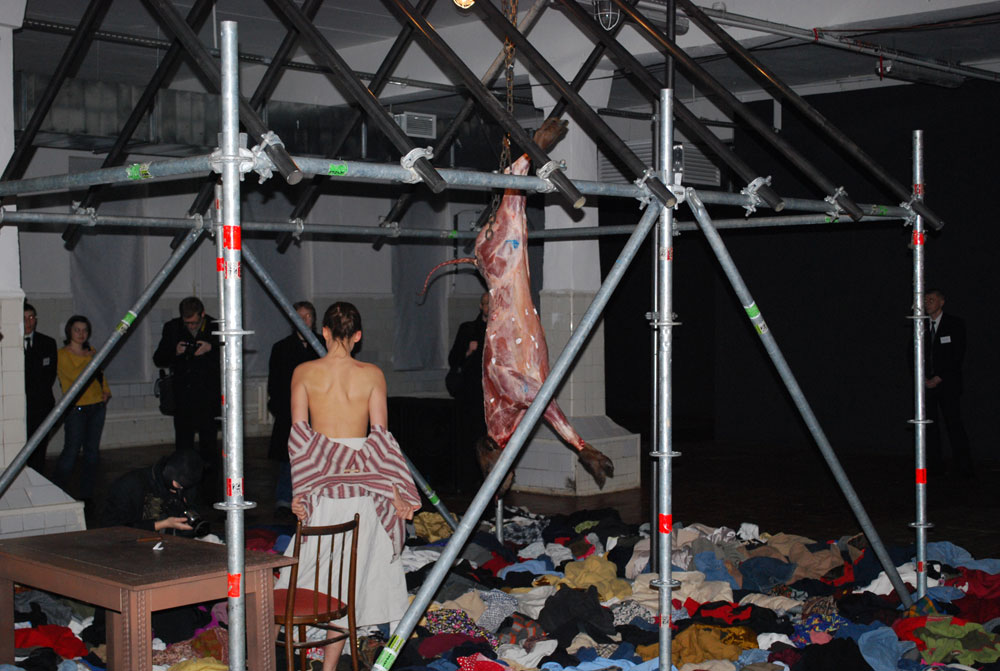 Надеюсь, им за вредность приплачивают. Мало того, что искусство с глубоким подтекстом, так еще и публика явно в армии не служившая и не собирающаяся этого делать. Народу море, молодежь и в возрасте люди. Вот, Николас Ильин с интересом перфоманс "Голые и смешные" смотрел. С перфоманса и начнем. Padal_1.jpg, padal_2.jpg, padal_3.jpg Элоиз Форниелез (Elois Fornieles). Перфоманс «Падаль». 2009. |