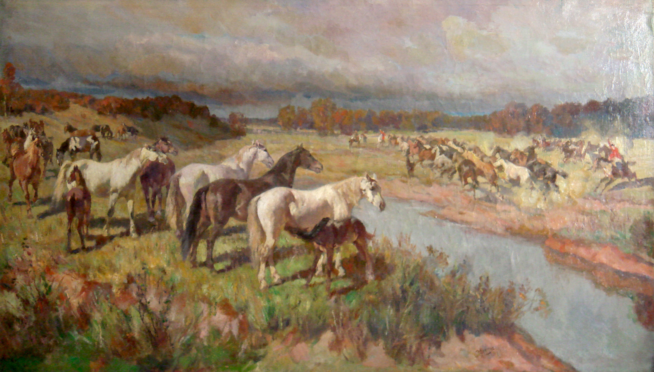 Размеры: 80х145 см, 1917 год, холст, масло. В прилепском имении Я.И. Бутовича Френц Р.Ф. начал большую композицию «Табун прилепских маток» , приехав на этот раз вместе с сыном, готовившимся к поступлению в Академию художеств. В свои почти восемьдесят лет Рудольф Фердинандович трудился буквально с юношеским задором. Законченная в 1912 году уже в Гатчине картина сразу понравилась заказчику, став по существу лебединой песней ветерана. Картину выставили в Петербурге, и критика высоко оценила её. \\\"Табун прилепских маток\\\" находится в музее коневодства Тимирязевской сельскохозяйственной академии. |