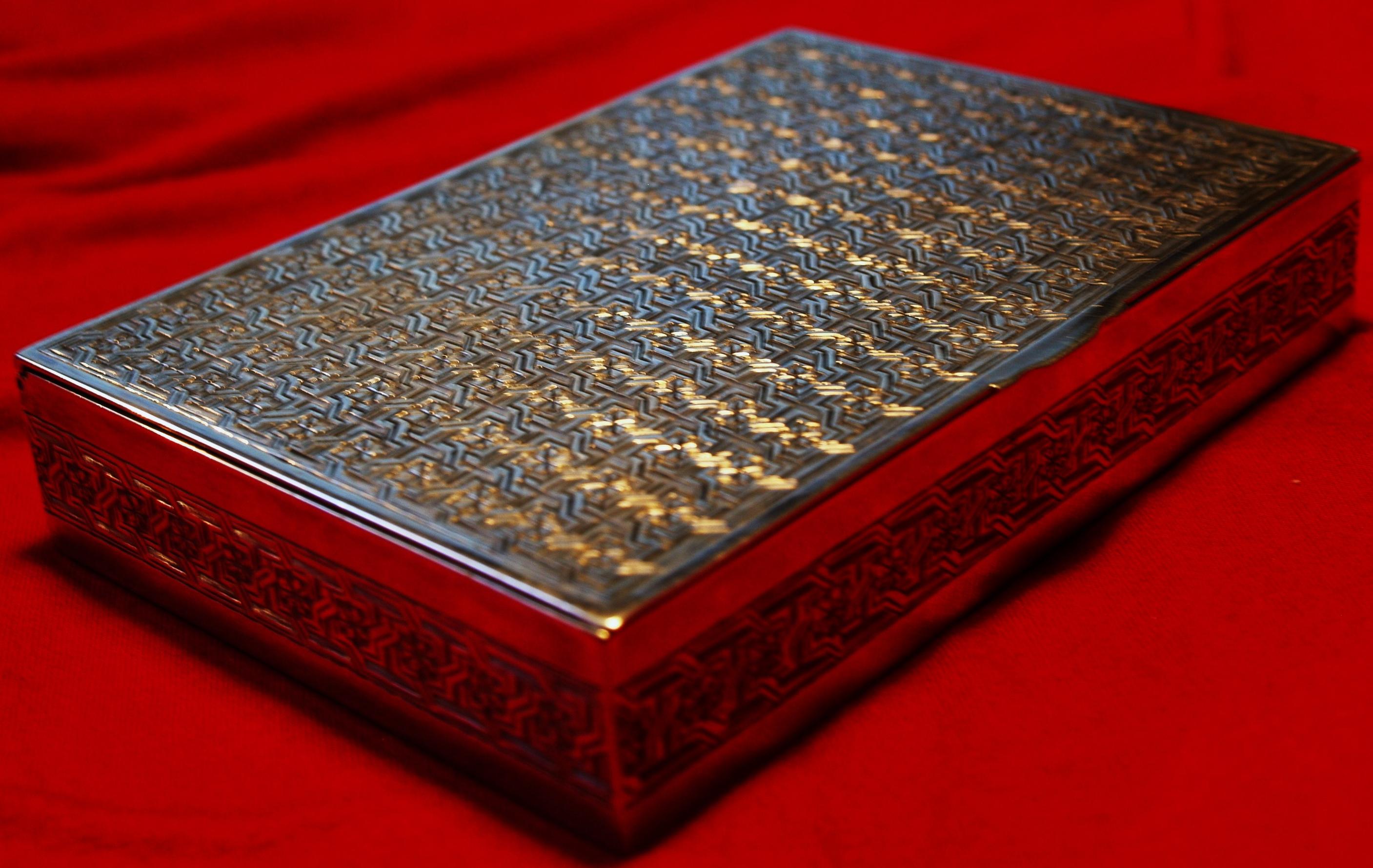 Шкатулка, серебро 84 пробы. 470 гр. Размер 14-9,5-2.5 см. Два клейма на крышке с обратной стороны, , три клейма на заднике. Все носит какой-то восточный характер.