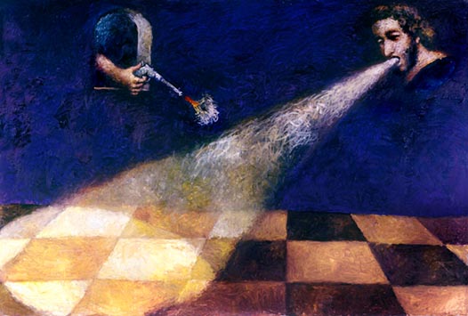 А какие вкусы называются буржуазными? Во-первых, я горожанин, человек города по складу своего сознания, а горожанин в переводе с французского – буржуа. Во- вторых, на моей памяти в «буржуазное», в крайнем случае, в «мелкобуржуазное» искусство записывали все – от импрессионистов до концептуалистов и «новых диких». А натюрморты Ломыкина и пейзажи Шишко считались «социалистическими». Кого-кого, а меня редко тянет на непринужденную легкость и декоративный «позитив». Мои вещи, как правило, многих «грузят» суггестией, внутренним драматизмом. Конечно, градус внешней агрессии с возрастом снижается. У двадцатилетнего художника, как правило, другая энергетика, чем у пятидесятилетнего. Илья Эренбург в своей книге «Люди, годы, жизнь» писал, что оценки старика порой напоминают разношенную обувь. То есть, наверное, то, что я делаю сейчас, воспринимается несколько спокойнее, чем то, что я делал лет 20 назад, но к «буржуазности», в моем понимании, это не имеет никакого отношения. У меня по-прежнему антибуржуазные вкусы, антибуржуазные позиции. И мне плевать на чьи-то поверхностные оценки.