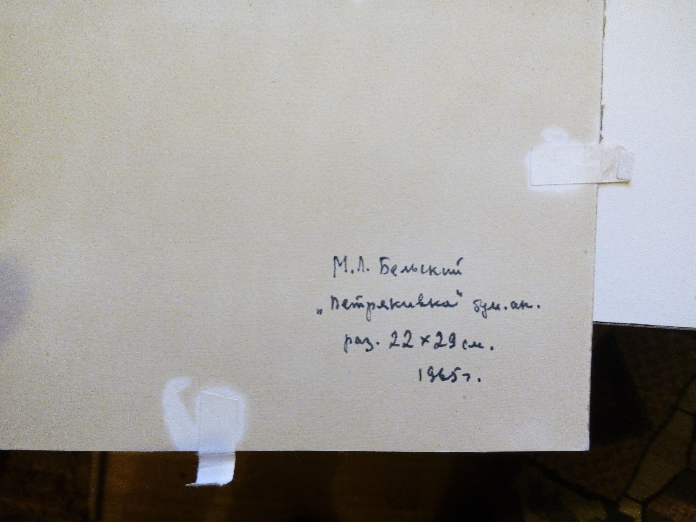 Бельский Михаил Леонтьевич. "Петрякивка" 1965 г. Бумага, акварель. Подпись в правом нижнем углу и на обороте. Размер 22x29 см. Есть повреждения от клея, видны на фото.