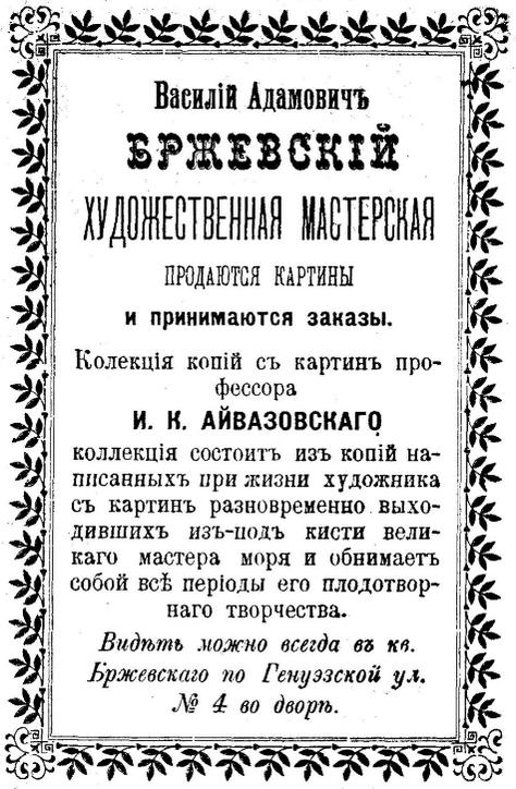 Василий Адамович Бржевский - один из лучших копиистов Айвазовского. При жизни мариниста Бржевский работал в его мастерской, а после смерти Айвазовского открыл художественную мастерскую в Феодосии, через которую продавал копии с полотен Айвазовского. Многие из работ В.А. Бржевского позже были перелицованы в Айвазовского. Картина, показанная Вами, является копией картины И.Айвазовского «Буря», хранящейся в Национальной картинной галерее Армении в Ереване.