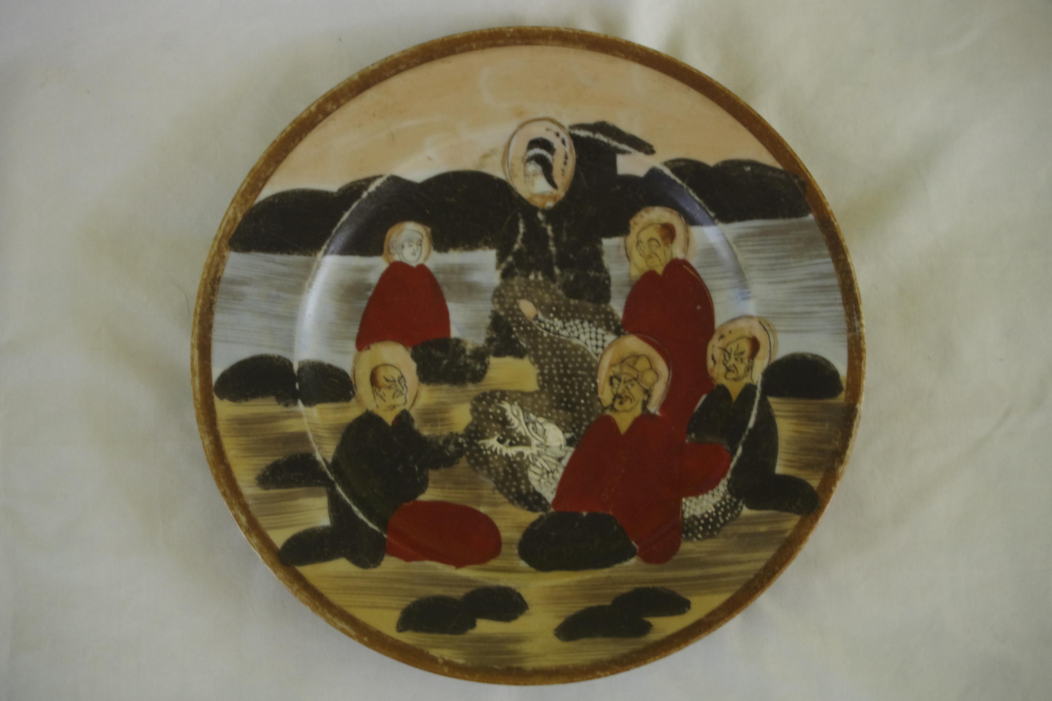 Редкая японская тарелка сатсума пр. 1900 - 1920 Собрание самураев. Хорошее состояние, краска имеет потёртости, осколов нет.