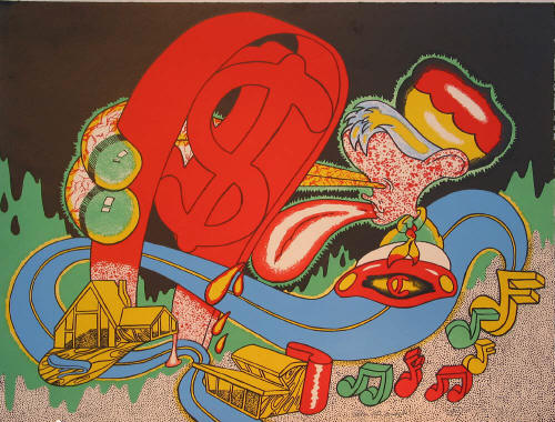 Great influence on the new French figurativistov had an American artist Peter Saul, the representative of the Chicago school of pop art in the early 1960's who lived in Paris. In the works of Saul combined eccentric comic book imagery and powerful pictorial gesture of abstract expressionism. Especially attractive for the European left has politicized artists Saul and his attack on bourgeois "good taste". "I have it carefully so as not to lose a single gram of vulgarity," said the artist. In his works, beginning 1960 Sol mercilessly mocks the values of American society, personified heroes of popular culture. In mid-1960 he actively opposed the Vietnam War, calling their work "indictment". His paintings are like political cartoons. Sol had a great influence on the style of real comics and applied graphics, making it one of the fathers of punk aesthetics.
