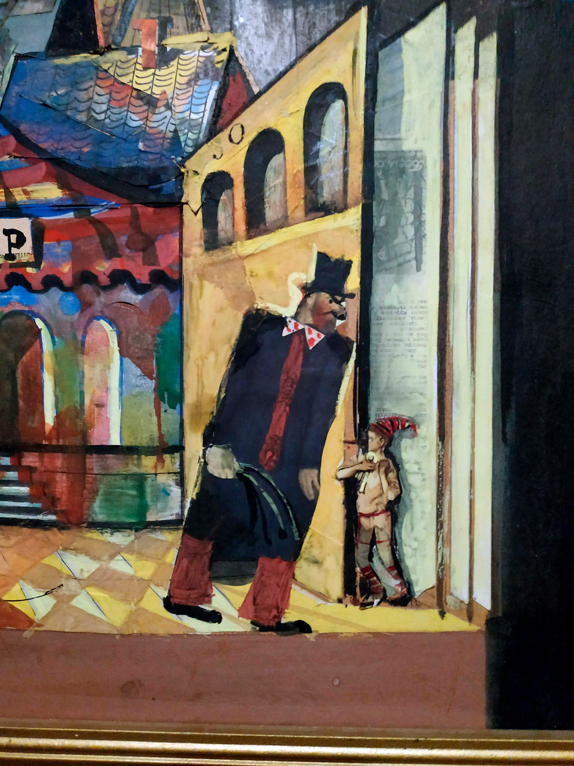 Подскажите пожалуйста, нашла интересную картинку, "Молодежный театр (Буратино)". Похоже на эскиз декораций театрального художника. Размер 40х60 см. Картон, бумага, коллаж, смешанная техника. По состоянию материалов оценила бы как 1980-е. По центру виднеется что-то похожее на подпись, но не могу прочитать. Подскажите пожалуйста, может кто-то знаком с творчеством? Спасибо! |