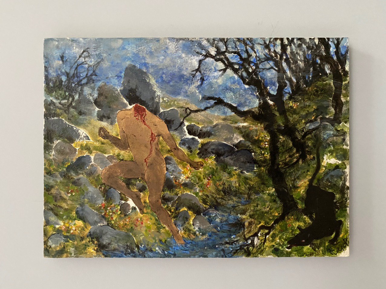 Нестор Поварнин, «У реки упавшая голова стала крысой», холст/акрил/тушь, 25 х 35 см., 2013 г.
