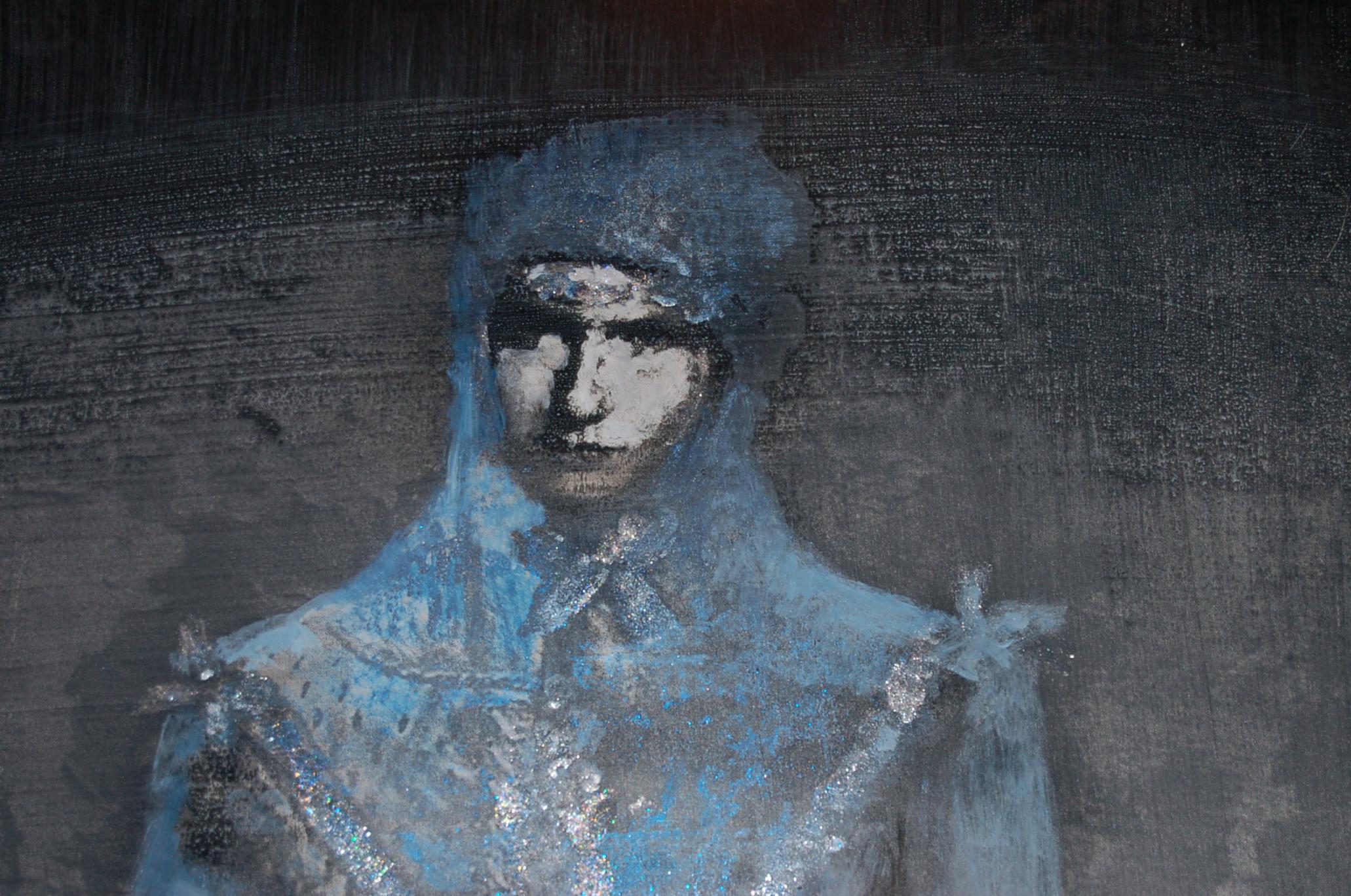Принты с изображением костюмов к опере являются фотоотпечатками на металле с применением оригинальной техники художника - нанесение дополнительного красочного слоя; процарапывание (scratching out), оставляя в изображении только важные для художника детали. Все в совокупности создает фактурность изображения. Так как в залах галереи было довольно слабое освещение фотографии сделаны со вспышкой и без, но поверьте, лучше смотреть "вживую"