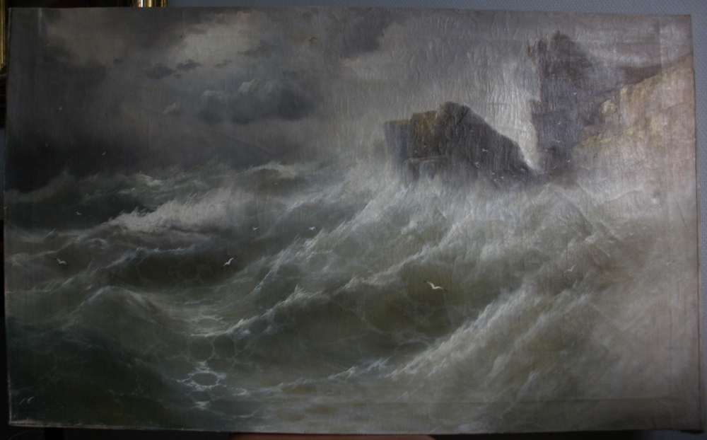 Без рамы 113- 70 см С рамой 147-104 см Рама позолоченная по полименту , новый подвижный подрамник, Необходима реставрация, приобретена в Одессе 1986 году . Сколько может быть стоить реставрация данной марины? |