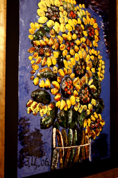 Выставка большая, привезли более 100 произведений, разместили в двух залах. В большом (в музее его называют Мраморным)-живопись, скульптура, бронзовые рельефы, в меньшем (на первом этаже)- шелкографии, очень интереные рельефные (или объёмные, как указано в описании) эмали.