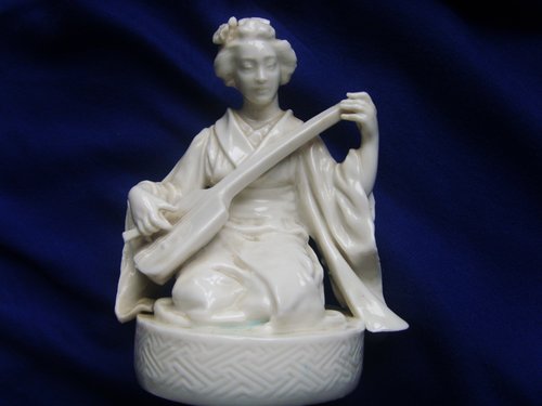 Гейша в кимоно играет на сямисэне, Китай тут совсем не при чем. А период определить сложно, она может быть и совсем недавней работой. В любом случае ей не больше 100 лет. Может быть и вообще европейская работа на японскую тему, если клейма нет, то что-то большее сказать сложно.