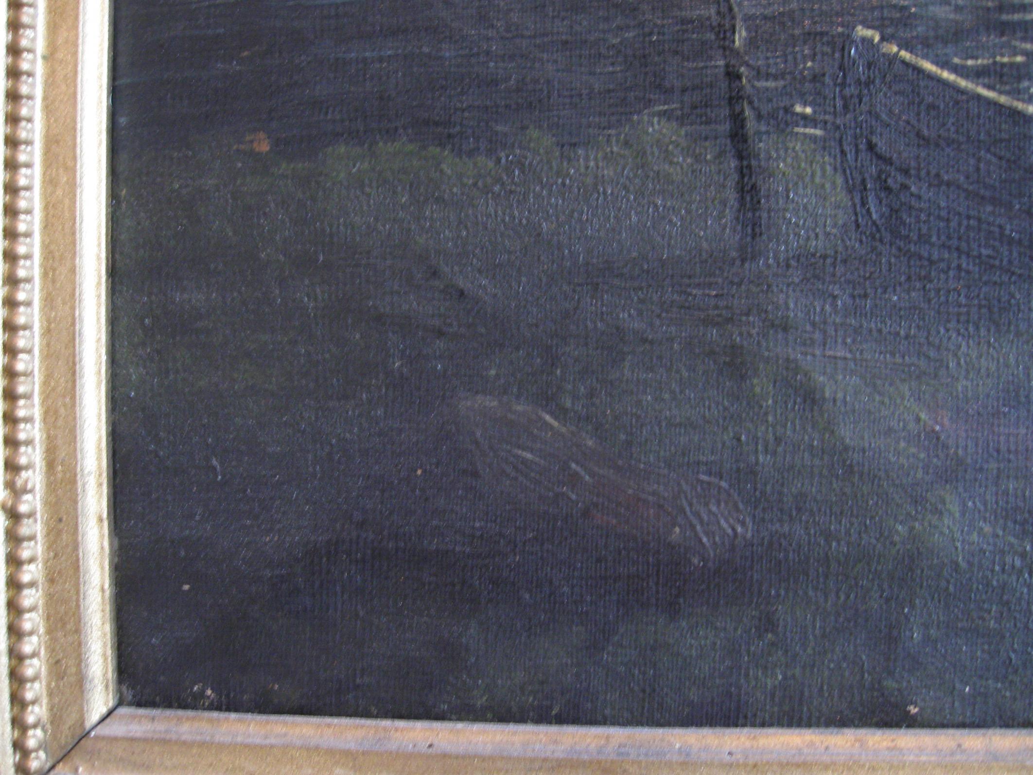 Подрамник дерево. Никаких подписей ни в углах, ни с обратной стороны не видно(не разобрать), так как картину чем то протирали после войны. Все повреждения получены во время войны от снарядных осколков. Мне известно только о том, что до начала войны она находилась в Стрельне, в доме прадеда. В какой момент он её приобрёл информации нет. Помогите,пожалуйста, определить возраст и автора картины. Последний раз редактировалось ольга акатова; 03.10.2010 в 23:30. Причина: фото лучшего качества |
