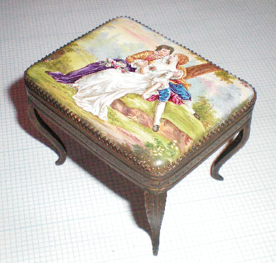 Several years ago, when she first came to me, I had a feeling that this is part of the toy headset, a small stool in the rococo style. Seat-enamel (vitreous enamel-painted poemali) for copper (in the corner-tiny chipped). legs and the rim of the metal bronze color with a simple engraving (snake with dots). Under a 10-fold increase in the pits, traces of yellow metal. On the back of enamel inserts a piece of extremely fragile cardboard (?) Teemno beige. Cardboard closed velvet the same color. In visiting the British transfer "Antic Roadshow" (in America) once viewings of the toy (works!) Mechanical piano with rospisnymi emalnymi inserts, mounted in metal .. that style drawing (painting), color scheme, clothing, metal framing and proportions were identical to my stool. The first feeling was that this harpsichord (piano) and my stool-set. The specialist explained to the owner that this is "historicism" -T.E. 18 th century forgery under the 17th and recommended insurance for $ 2000 -3000 $ .. Shl: why the price seemed to me a spoon with enamel on the "Trinity" overpriced ($ 2000) .. Are there any considerations? Thanks in advance! |