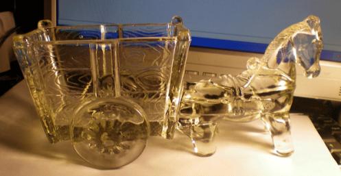 Размер 24-10,5-8,5 (плюс-минус- пару мм) Лошадка, везущая короб(?).(я её назвала "сосуд для икры") Стекло оттенка белого вина (шампанского?) Если наполнить тачку икрой, то будет вполне феншуйский вариант инсталляции "жизнь удалась!" "Что, где, когда (и почём)"-неизвестно.. Поделитесь мыслями. Спасибо. |